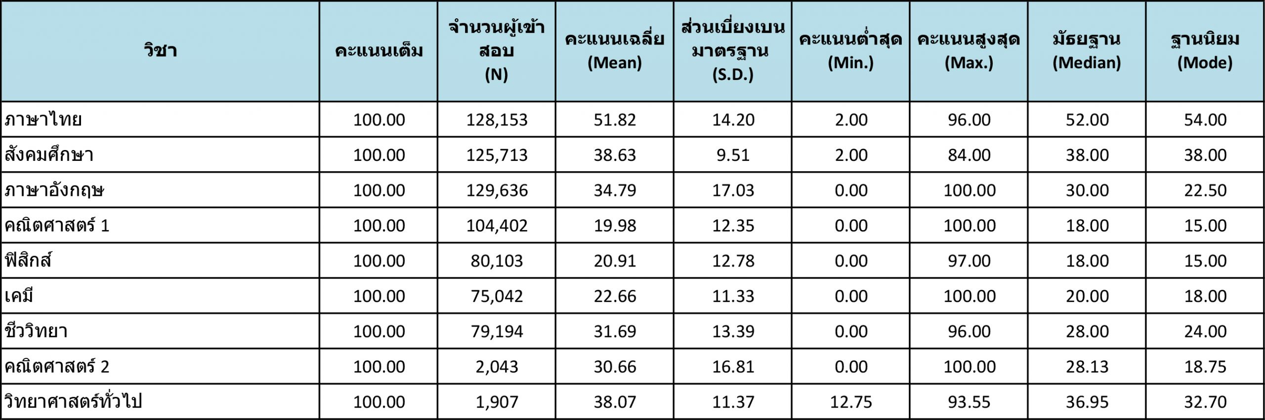 รายงานค่าสถิติพื้นฐาน การสอบวิชาสามัญ ประจำปี 2564 รายงานค่าสถิติพื้นฐาน การสอบวิชาสามัญ ประจำปี 2564 ประกอบด้วย 9 วิชา ภาษาไทย, สังคมศึกษา, ภาษาอังกฤษ, คณิตศาสตร์ 1, ฟิสิกส์, เคมี, ชีววิทยา, คณิตศาสตร์ 2, วิทยาศาสตร์ทั่วไปโดยมีสถิติพื้นฐาน ดังนี้ 1. คะแนนเต็ม 2. จำนวนผู้เข้าสอบ (N) 3. คะแนนเฉลี่ย (Mean) 4. ส่วนเบี่ยงเบนมาตรฐาน (S.D.) 5. คะแนนต่ำสุด (Min.) 6. คะแนนสูงสุด (Max.) 7. มัธยฐาน (Median) และ 8. ฐานนิยม (Mode) -คลิกที่ภาพเพื่อดูขนาดใหญ่- TAG:TCAS, เรียนออนไลน์, เรียนTCAS, เรียนพิเศษTCAS, คลังข้อสอบ, คอร์สติวpat2, คอร์สpat2 กลับไปหน้าบทความหลัก กลับไปคลังข้อสอบ