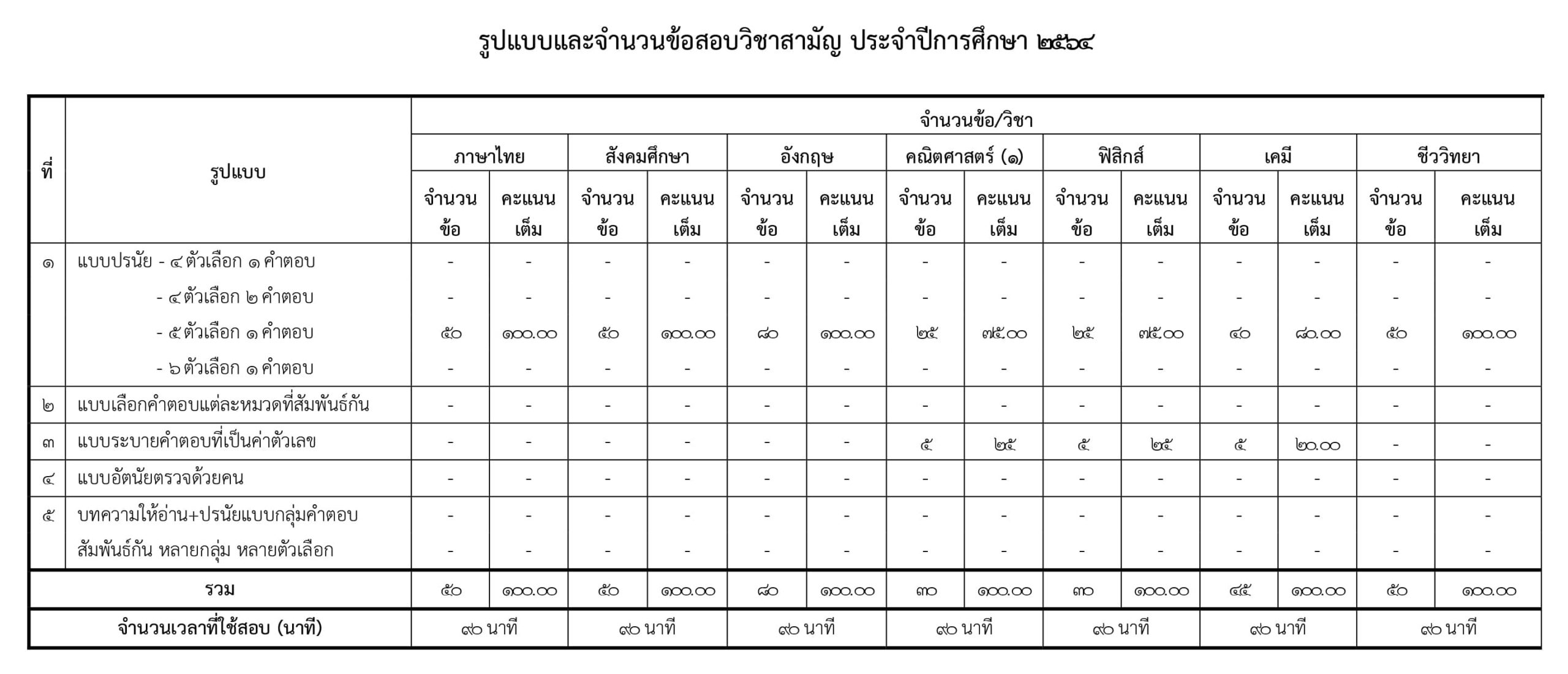 รูปแบบข้อสอบและจำนวนข้อสอบ วิชาสามัญ 64 รูปแบบและจำนวนข้อสอบวิชาสามัญ ประจำปีการศึกษา 2564รูปแบบประกอบด้วย 1. แบบปรนัย 2. แบบเลือกคำตอบแต่ละหมวดที่สัมพันธ์กัน 3. แบบระบายคำตอบที่เป็นค่าตัวเลข 4. แบบอัตนัยตรวจด้วยคน 5. บทความให้อ่าน + ปรนัยแบบกลุ่มคำตอบสัมพันธ์กัน หลายกลุ่ม หลายตัวเลือกจำนวน 7 วิชา ได้แก่ ภาษาไทย, สังคมศึกษา, อังกฤษ, คณิตศาสตร์ (1), ฟิสิกส์, เคมี และ ชีววิทยา -คลิกที่ภาพเพื่อดูขนาดใหญ่- TAG:TCAS, เรียนออนไลน์, เรียนTCAS, เรียนพิเศษTCAS, ติว9วิชาสามัญ, คลังข้อสอบ กลับไปหน้าบทความหลัก กลับไปคลังข้อสอบ