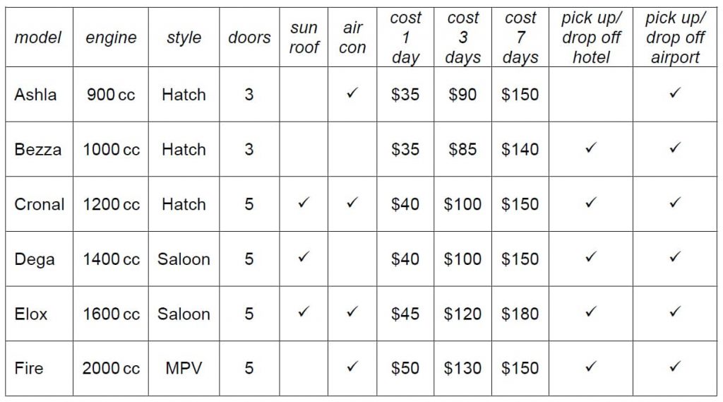 I will need to hire a car for my holiday and I have a number of requirements. I want to pick up the car at the hotel at the beginning of the holiday, but drop it off at the airport at the end of the holiday. The car must have a sun roof and air con. However, I do not want a car above 1600 cc, and I can only afford to pay up to $160 for 7 day hire.