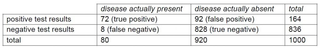 The hospital serving a small town tests 1000 children for the presence of the disease. The table below provides the results as expected in terms of the test’s 90% accuracy level.