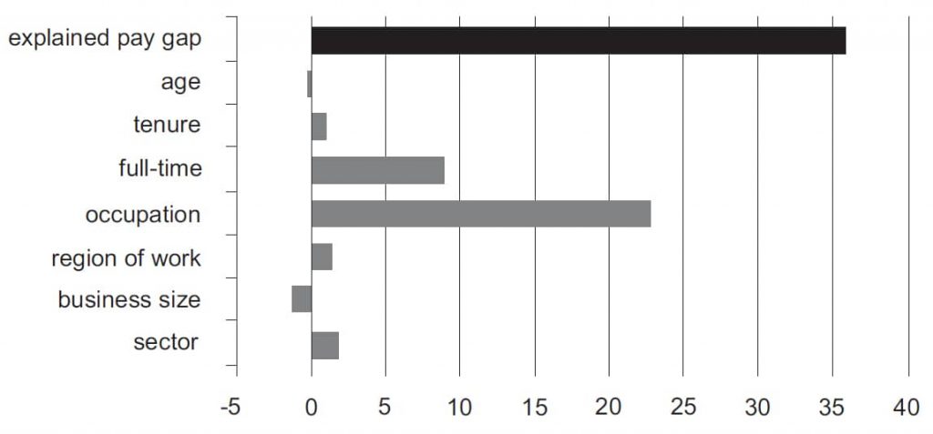 The analysts said that this did not mean that two thirds of the gap must be attributable to pay discrimination by employers, because women’s relative academic qualifications and domestic caring responsibilities are also likely to be factors that they did not capture in their modelling exercise. But they did say that pay discrimination might be part of the explanation for the unexplained gap. Figure 1 outlines how the factors that were investigated contributed to the explained part of the gap.
