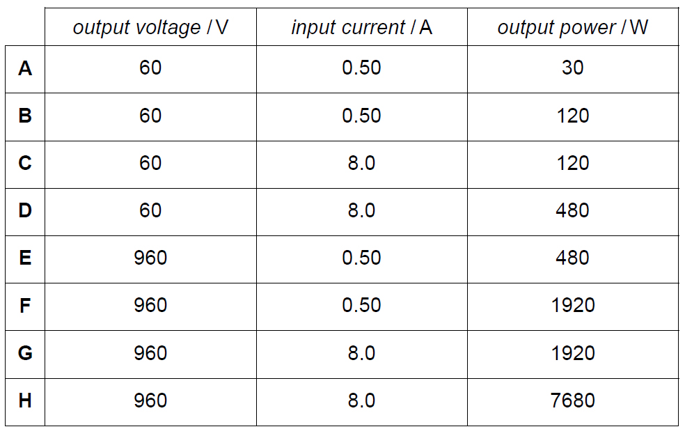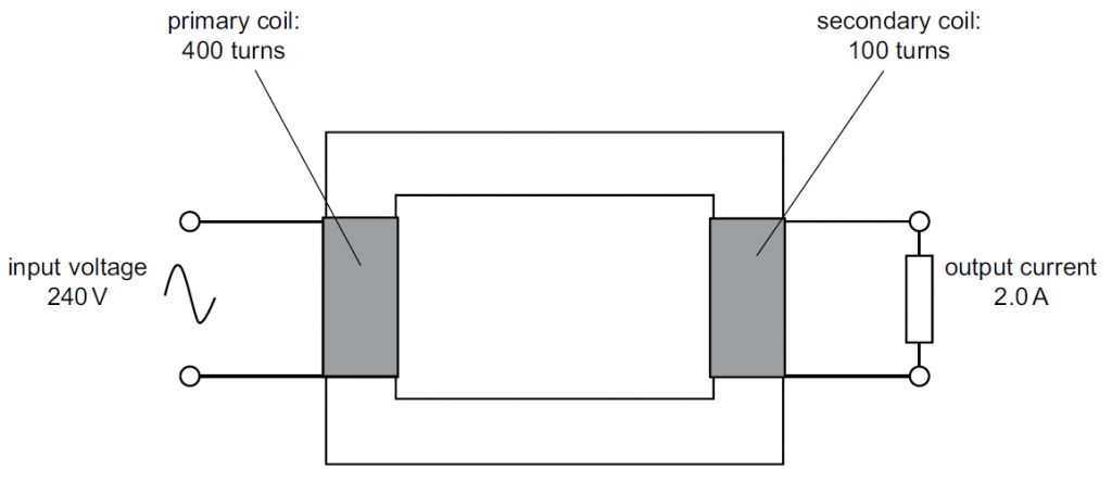 27. A 100% efficient ideal transformer has 400 turns on its primary coil and 100 turns on its secondary coil. The input voltage across the primary coil is 240V. An output current of 2.0A flows in the secondary coil.