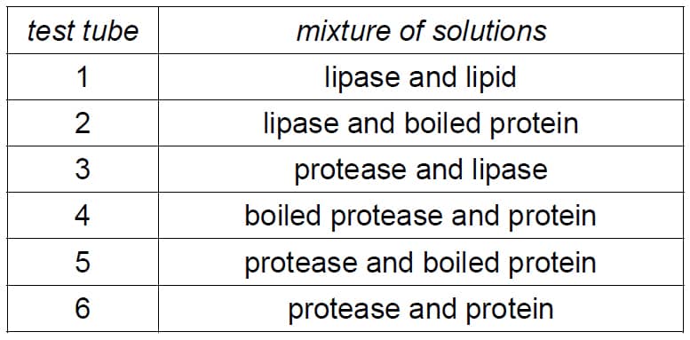 17. Six test tubes were set up. Two different solutions were added to each test tube as shown in the table.