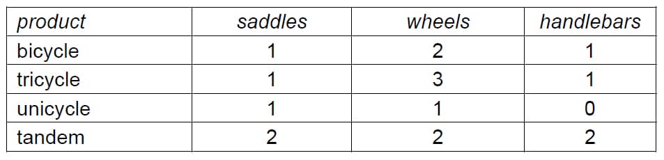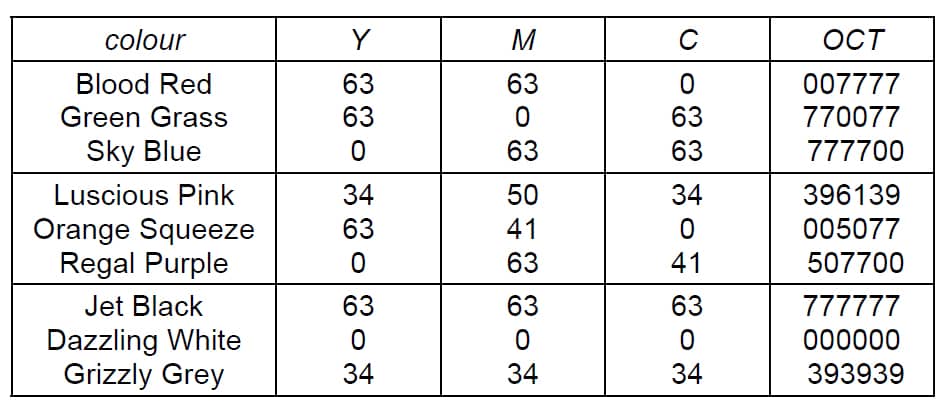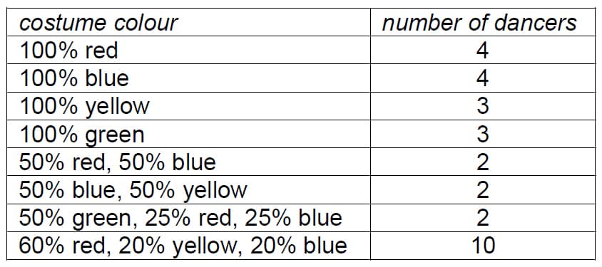 12. Meg is making costumes for the 30 members of the Rainbow Dancers, for their annual show. The costumes can be made in a variety of colour combinations, as shown in the following table. The table also shows the number of dancers who will have each variety of costume.