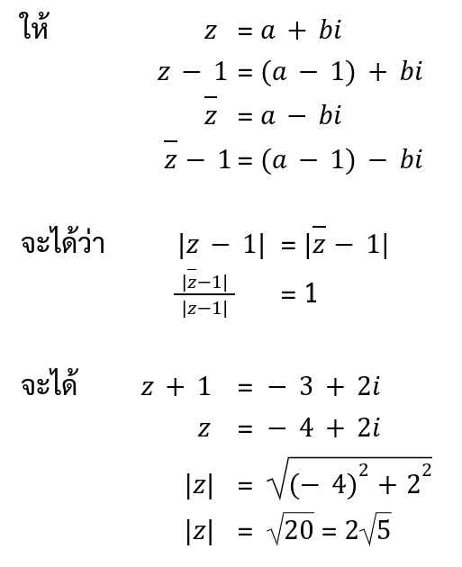 1. ถ้า z เป็นจำนวนเชิงซ้อน ซึ่งสอดคล้องกับสมการ z + |z-1⁄z-1| = -3 + 2i แล้ว |z| มีค่าเท่ากับข้อใดต่อไปนี้ (สามัญ1 ปี’59)