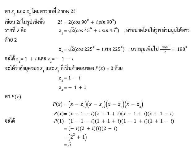 2. ถ้ากำหนดให้ P(x) เป็นพหุนามดีกรี 4 ซึ่งมีสัมประสิทธิ์เป็นจำนวนจริง และสัมประสิทธิ์ของ x4 เท่ากับ 1 ถ้า z1 และ z2 เป็นรากที่ 2 ของ 2i และเป็นคำตอบของสมการ P(x) = 0 ด้วย แล้ว P(1) มีค่าเท่ากับข้อใดต่อไปนี้ (สามัญ ปี’56)