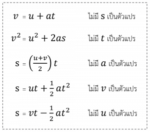 สูตรที่ใช้คำนวณการเคลื่อนที่แนวตรงที่มีความเร่งคงตัว จะมี 5 สูตร คือ
