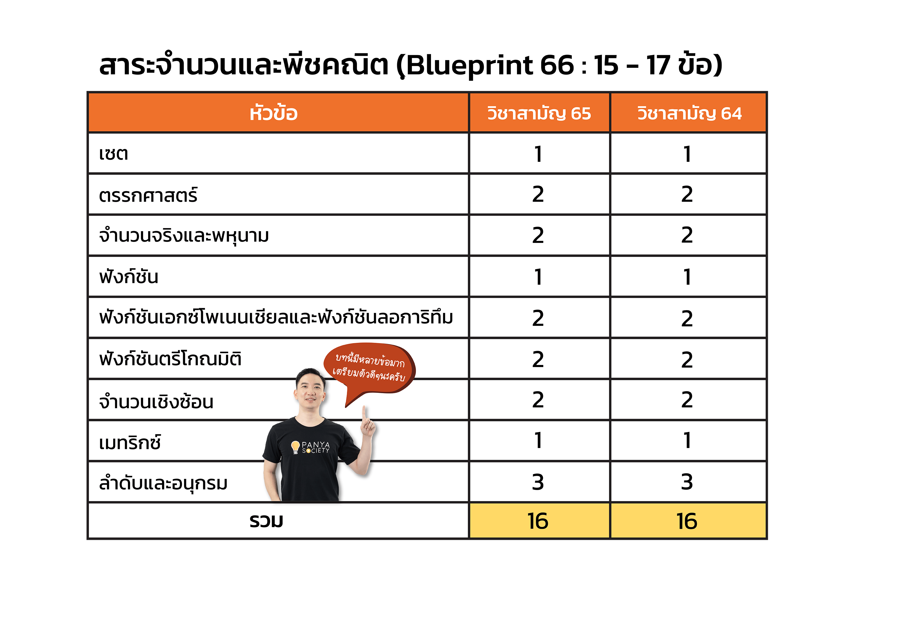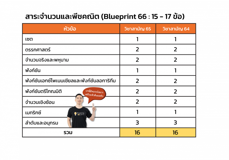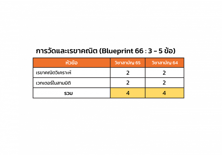 • แล้วถ้าจำนวนข้อที่ออกในเนื้อหาแต่ละบทอ้างอิงจากข้อสอบ คณิตศาสตร์ วิชาสามัญปี 65 และ 64 เราก็สามารถอนุมานได้ว่าเนื้อหาที่ออกสอบก็น่าจะอ้างอิงจากแหล่งเดียวกัน