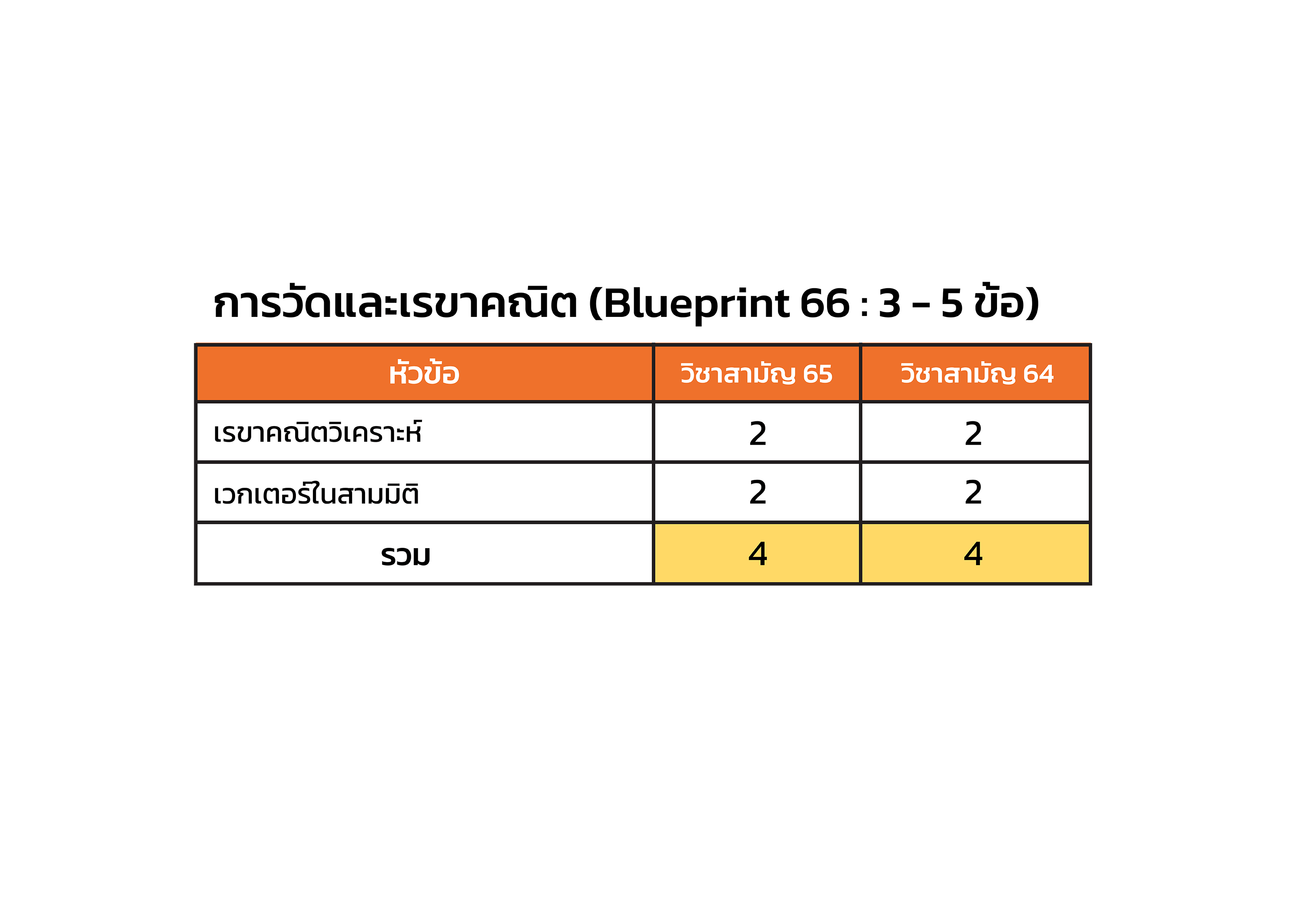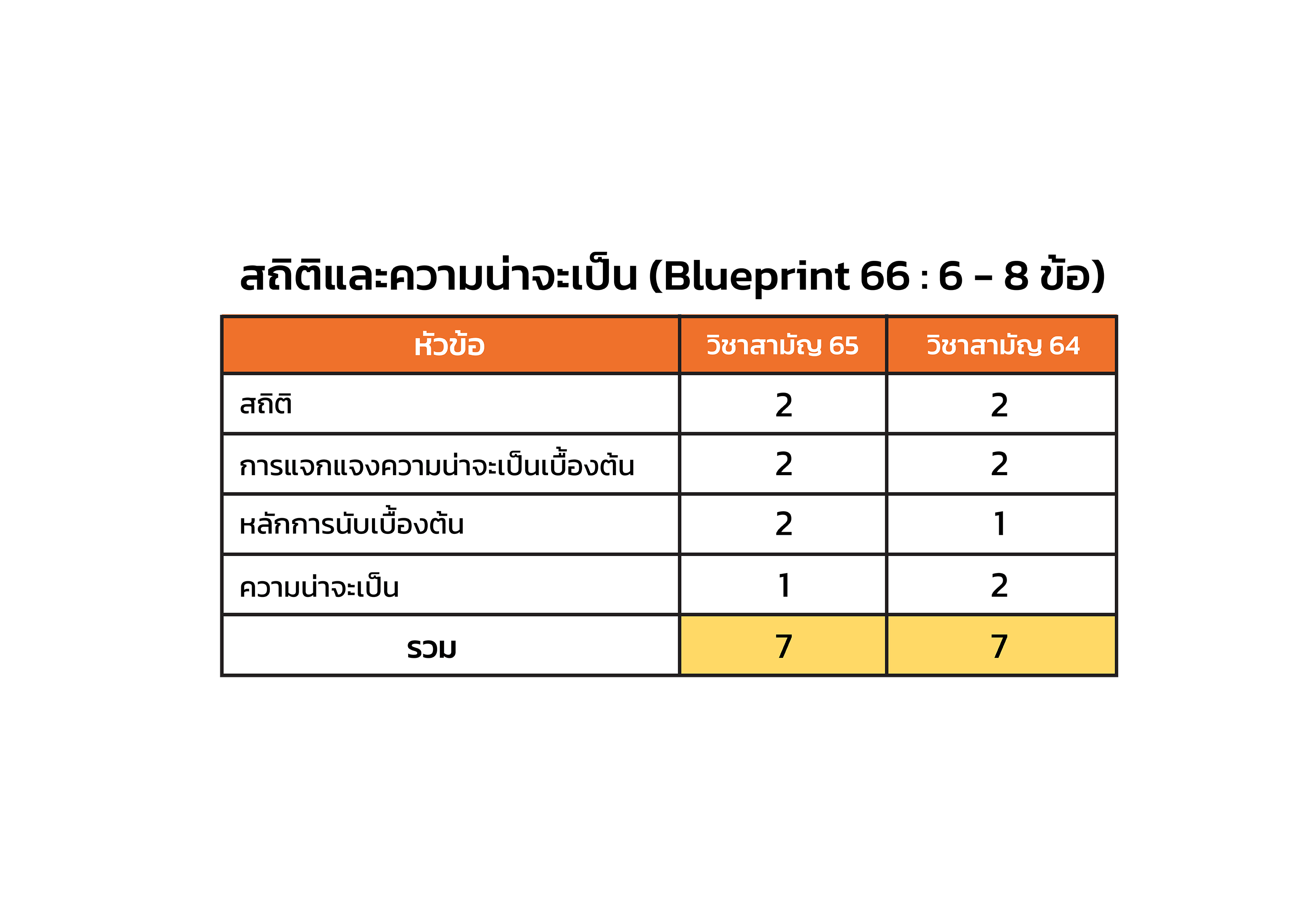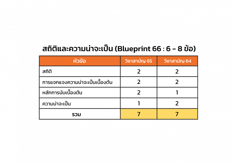 คราวนี้เราลองมาดูสถิติการออกข้อสอบว่าแต่ละเนื้อหามีการออกสอบมาก – น้อยแค่ไหน เมื่อเปรียบเทียบระหว่าง คณิตศาสตร์ วิชาสามัญปี 2564 และ 2565 กับ Exam Blueprint ของ A-Level วิชาคณิตศาสตร์ ปี 2566 (ดู Exam Blueprint ของ A-Level วิชาคณิตศาสตร์ ปี 2566 อย่างละเอียดได้ที่นี่)