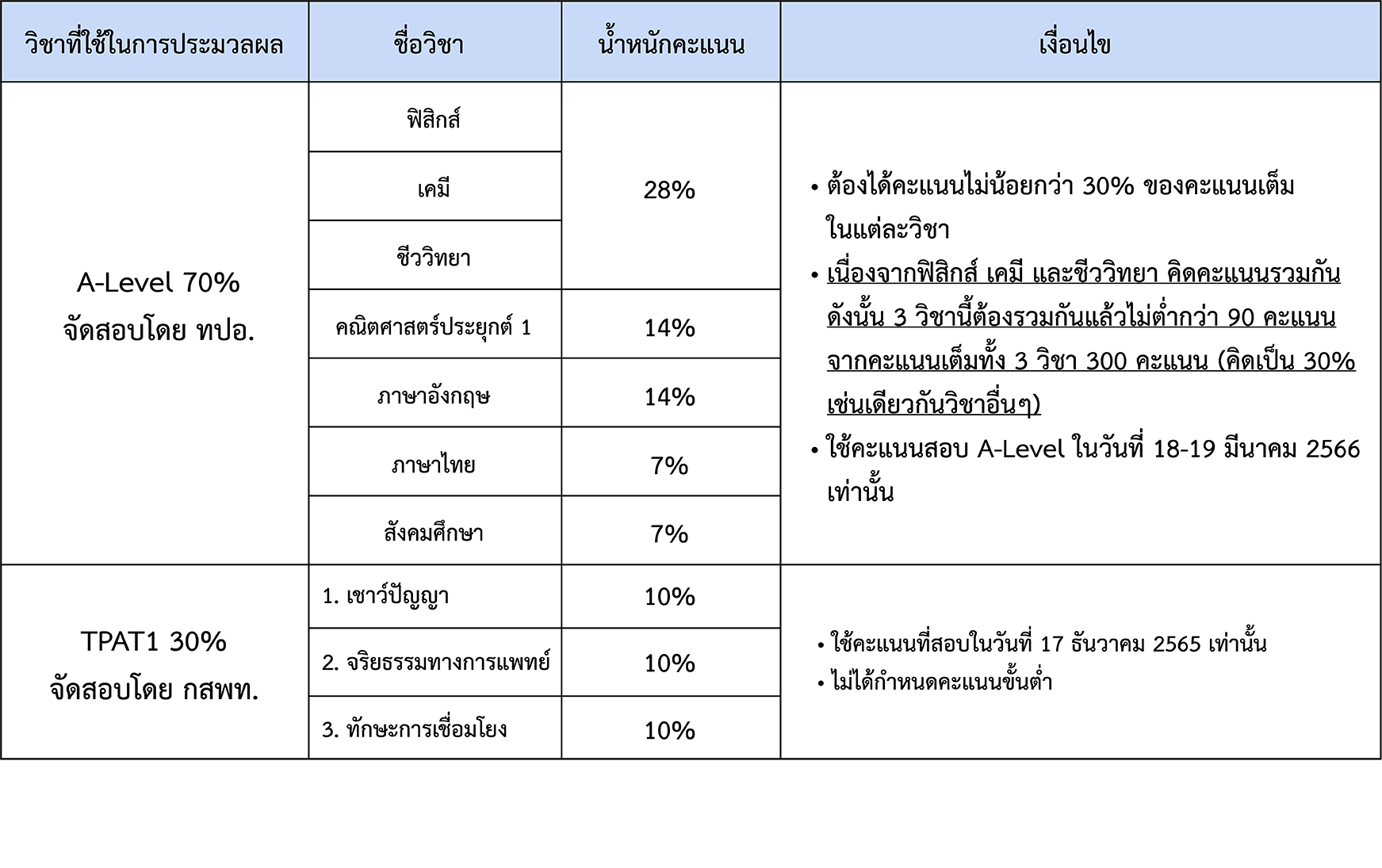 โดย กสพท. มีหน้าที่ออกข้อสอบ TPAT1 และร่วมกับ ที่ประชุมอธิการบดีแห่งประเทศไทย (ทปอ.) ในการคัดเลือกนักเรียนเข้าศึกษาต่อมหาวิทยาลัยใน 4 คณะดังกล่าว โดยจะมีการคิดคะแนนของข้อสอบจากทั้ง 2 หน่วยงานในอัตราส่วนที่แตกต่างกัน คราวนี้เรามาดูกันดีกว่าว่าในระบบ TCAS66 การคัดเลือกเข้าสู่คณะของ กสพท. เหล่านี้น้องๆ จะต้องสอบวิชาอะไร รวมไปถึงหลักเกณฑ์คะแนนขั้นต่ำของแต่ละวิชาว่าเป็นอย่างไรกันบ้างครับ