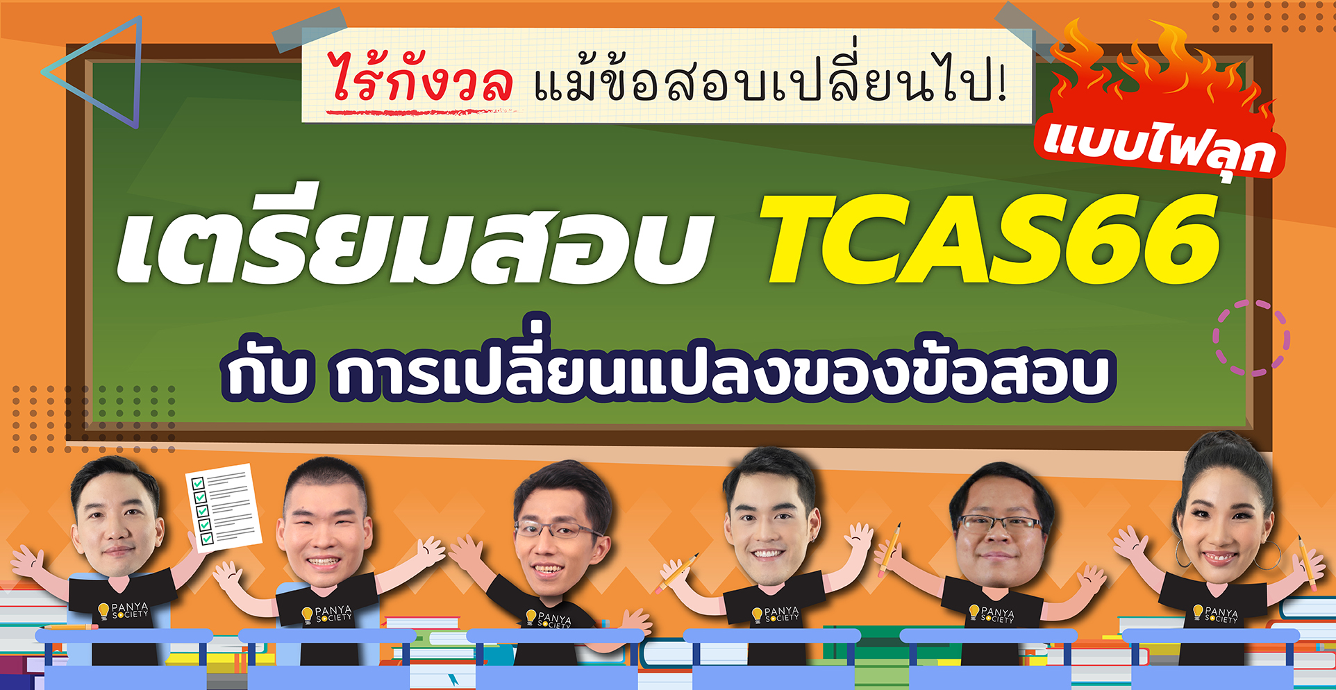จากการเปลี่ยนแปลงข้างต้น ทำให้น้องๆทุกคนควรจะรีบเตรียมตัวตั้งแต่วันนี้ ดังนั้น พี่ PANYA ขอแนะนำคอร์ส “TCAS66 ทั้ง 6 วิชาจาก PANYA SOCIETY” ซึ่งเป็นคอร์ส เตรียมตัวสอบ TCAS66 ฉบับสมบูรณ์แบบ ที่ Update ล่าสุด ได้ทั้งทบทวนเนื้อหา ม.4-5-6 ไปพร้อมกับเก็งข้อสอบแนวรูปแบบใหม่ ฝึกทำข้อสอบเพียบ ทบทวนเต็มที่ เก็งข้อสอบแม่นยำ พร้อมทำโจทย์แนวใหม่ ไม่ตกเทรนด์ พร้อมกับโค้ชผู้ช่วยส่วนตัวที่ถาม-ตอบได้ตลอด 24 ชั่วโมง