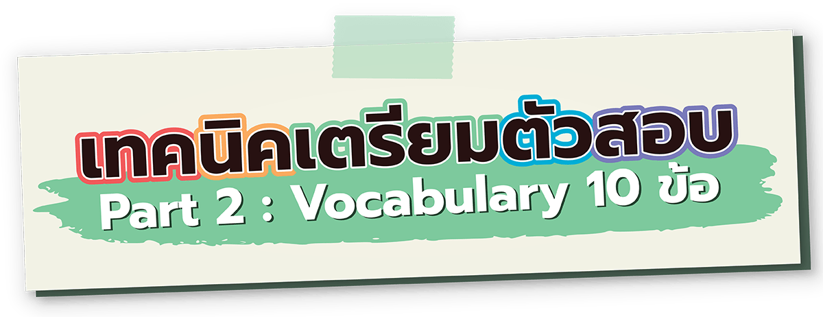สำหรับการทำข้อสอบ GAT English Part นี้ คนที่ไม่ได้ท่องศัพท์มาเลย หรือมี Vocabulary Stocks น้อยมาก ๆ ทำให้ไม่สามารถดึงคลังศัพท์มาใช้งานได้ ถึงเวลาแล้วที่ นักเรียนจะเริ่มทบทวนคำศัพท์ภาษาอังกฤษ และพยายามเร่ง Speed กับการฝึกทำข้อสอบในส่วนคำศัพท์ภาษาอังกฤษให้มากขึ้น เพราะหลาย ๆ ปี คำศัพท์ยาก ๆ ที่เคยออกแล้วใน Part นี้ วนซ้ำผ่านตามาให้เราได้เห็นกันอีกอยู่บ่อยครั้ง ดังนั้น การเรียนภาษาอังกฤษ กลุ่ม คำศัพท์ผ่านการทำข้อสอบ และเข้าใจโครงสร้างของคำจากการฝึกดู Choice และตัดข้อที่คิดว่าไม่ใช่ออกได้แม่นยำ ก็ทำให้โอกาสตอบถูกมีอยู่สูงมากเลย