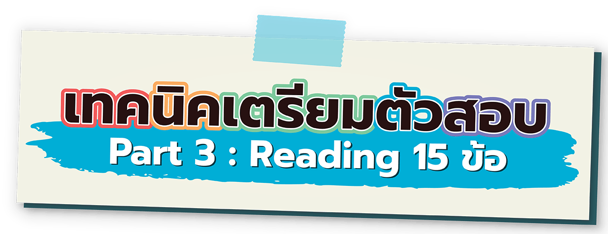 เทคนิคที่อยากแนะนำคือ “การหา Main Idea ของเส้นเรื่องให้เจอก่อน และทำความเข้าใจโจทย์เบื้องต้น จึงค่อยกลับมาอ่าน Passage ไล่ตามรายละเอียดของแต่ละข้อ” เพราะการอ่าน Passage ยาว ๆ ใช้เวลาค่อนข้างมาก ถ้าน้อง ๆ ไปใช้เวลาในการเก็บรายละเอียด และอ่านจนเข้าใจโดยใช้เวลาในห้องสอบเพลิดเพลินกับ Reading Part จะทำให้ทำข้อสอบไม่ทันแน่นอน ดังนั้น จับประเด็นให้เจอ ผ่านการอ่านคร่าว ๆ กวาดตาไปก่อน 1 รอบ แล้วไปดูโจทย์ ค่อยกลับมาอ่านรายละเอียดใน Passage อีกที เพื่อหาคำตอบในแต่ละห้วง มีโอกาสทำโจทย์ Reading ได้ง่ายกว่า ‘อย่าเสียเวลากับการอ่านจนทำข้อสอบไม่ทัน’